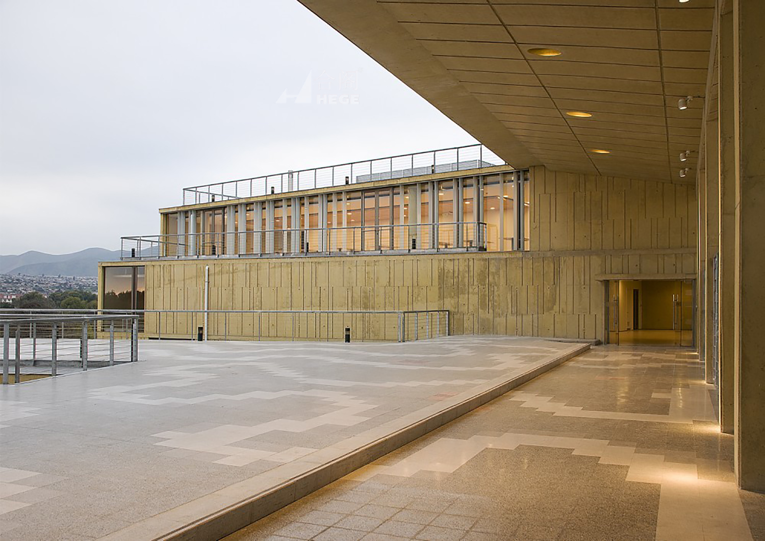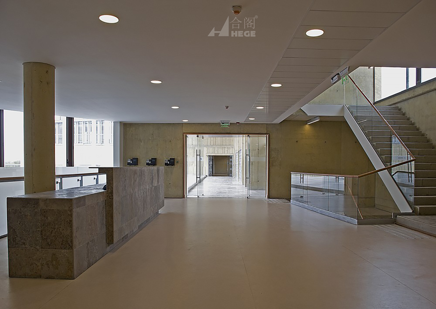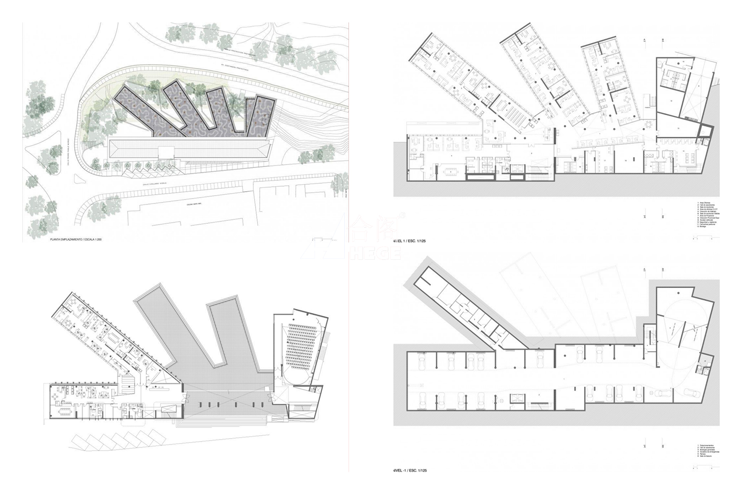 建筑面向在城市與河流間的落客區(qū)分成了幾個體塊,并在其間形成了開放的露臺。這些露臺將河濱景觀引入建筑,恢復(fù)了老城的視廊。兩棟核心建筑被與街道平面連接的部分拱衛(wèi)著。東部的體塊包含大禮堂、多功能廳及在二層的餐廳。餐廳與一個開放的觀景平臺相連。大禮堂占用兩層,因而可以從外部通過上層進入,也可以從內(nèi)部的下層進入。