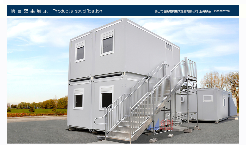 五、拆裝方便,性能優(yōu)越,穩(wěn)定牢固,防震性能好,防水防火防腐,重量輕。房屋為整體結(jié)構(gòu),內(nèi)有框架,墻體為鋼板,可用木板飾面,可整體遷移,使用壽命可達(dá)20年以上。