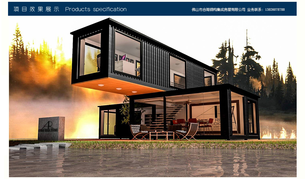 五、拆裝方便,性能優(yōu)越,穩(wěn)定牢固,防震性能好,防水防火防腐,重量輕。房屋為整體結(jié)構(gòu),內(nèi)有框架,墻體為鋼板,可用木板飾面,可整體遷移,使用壽命可達(dá)20年以上。
