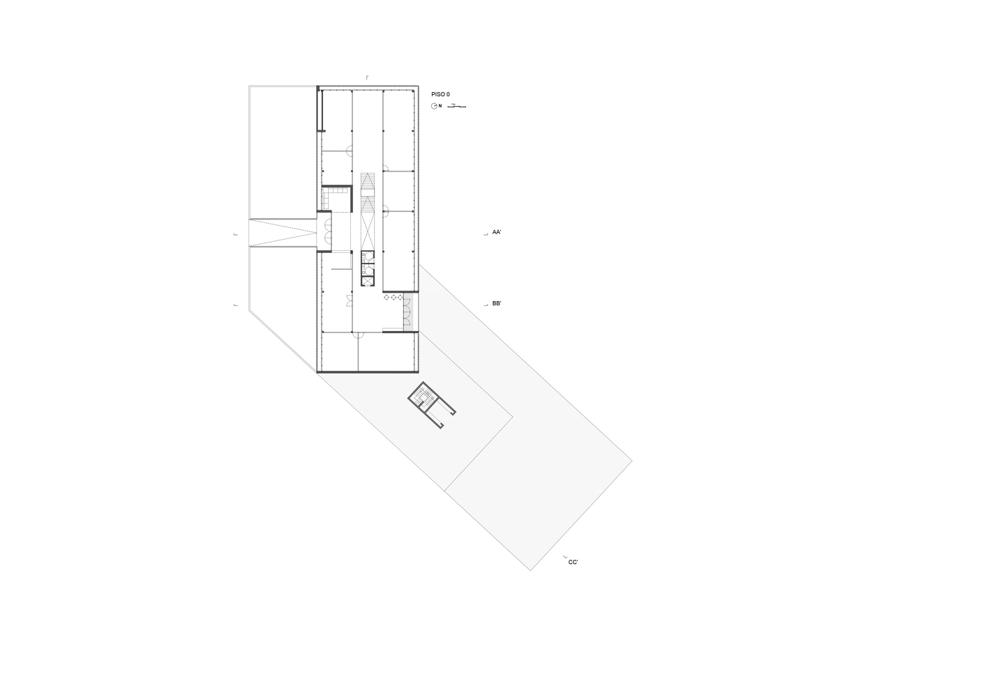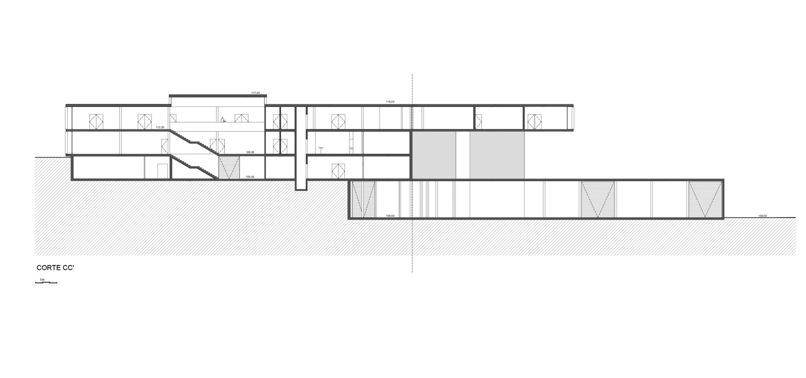 辦公空間與工具房相連,工具房凹陷到地面以下,同時在西邊有入口。因此,我們有兩層樓是在地面以上的和兩層樓在地面一下的,地下兩層設置在地下,以便直接進入外部,即負一層和負二層。