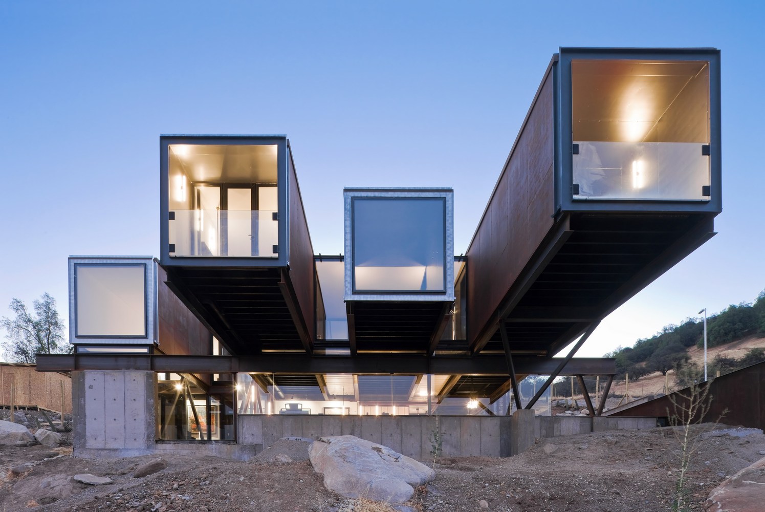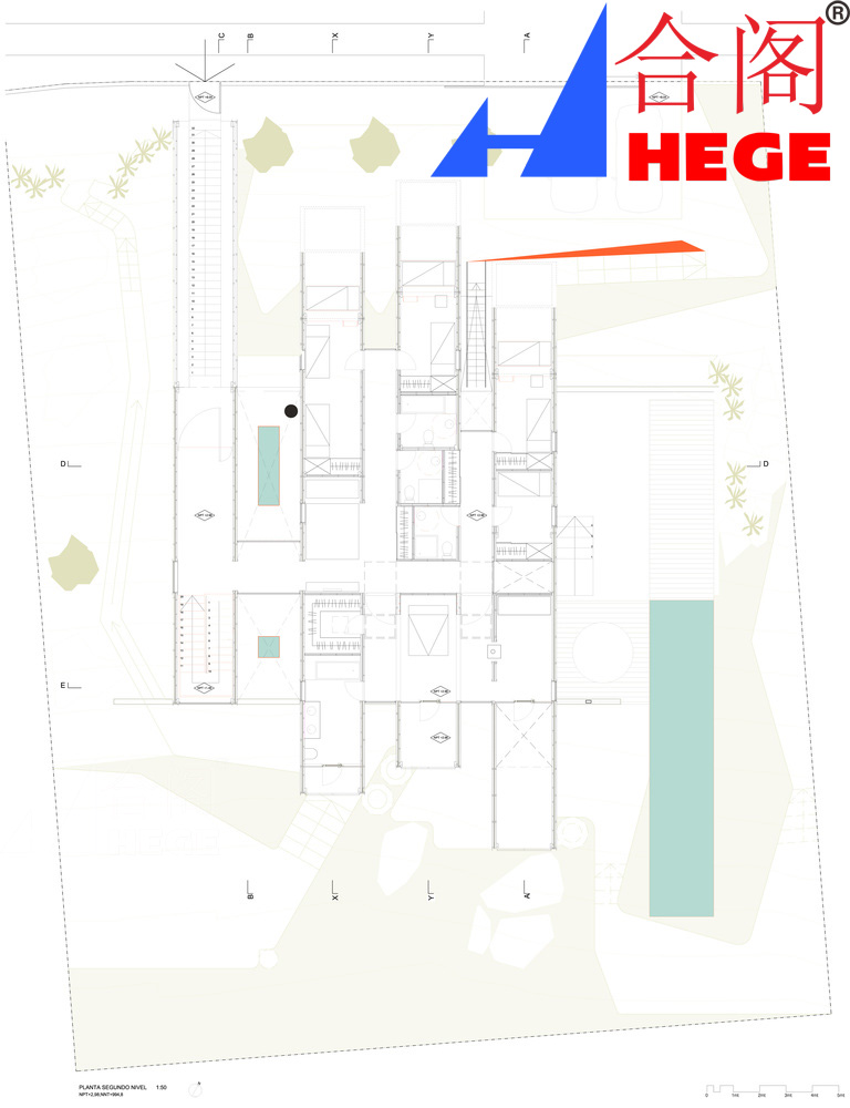 建設(shè)階段包括:第一階段;放置擋土墻,創(chuàng)造一個(gè)水平面,放置住宅的公共區(qū)域。第二階段:將集裝箱安裝在頂部,用作私人區(qū)域,用一種統(tǒng)一的材料包裹容器,這種材料整合了各個(gè)部分,也創(chuàng)造了通風(fēng)。