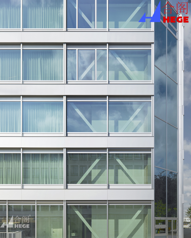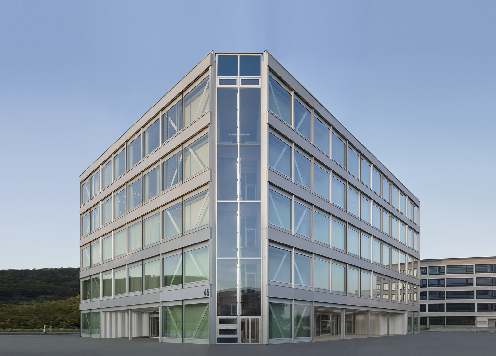 該項目是一個多功能辦公大樓。它讓人聯(lián)想到“工業(yè)宮殿”,傳達出一種尊嚴和代表性。垂直交叉的橫梁突出了其邊界,提出了其特定的結構概念,并參照其制造背景,高品質而冷靜的材料創(chuàng)造出一種精致而低調的優(yōu)雅。簡單的立方體是有重輕鋼混合搭建,高23米,占地面積為50 × 36米。最引人注目的是,將基礎設施和循環(huán)元素轉移到角落,釋放了地面上所有樓層的中心,形成一個暴露的、無柱的室內空間。這個工業(yè)立方體的開放展示了空間、視覺和象征品質,進一步體現(xiàn)在非凡的室內空間。