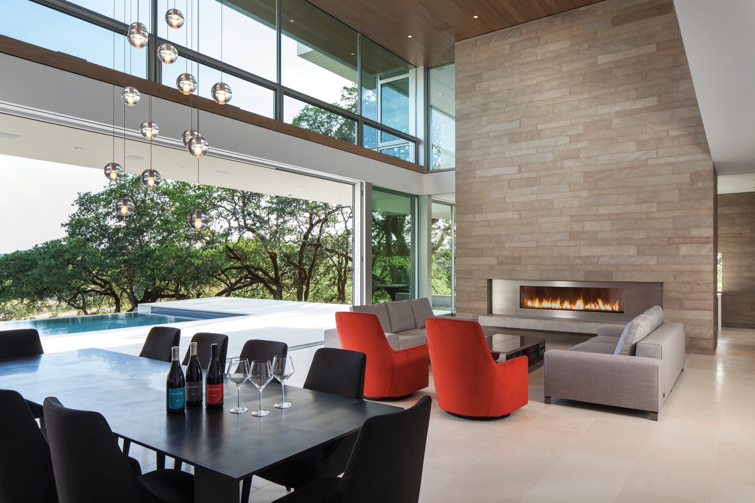 家庭內(nèi)部利用溫和的氣候和最大化采光以及自然通風(fēng)的機(jī)會(huì)。從東到西都用玻璃覆蓋,這樣的設(shè)計(jì)使得自然光能夠滲透到整個(gè)空間,在白天就不用使用人工照明。暖氣和冷氣的交替使用則使得在夏天能夠躲開(kāi)炎熱的陽(yáng)光,同時(shí)在冬天能夠保持室內(nèi)的溫度。在建筑北側(cè)的森林能夠保護(hù)屋內(nèi)隱私同時(shí)起到遮陽(yáng)的作用,在早晨和傍晚也能避免陽(yáng)光直射。東西外墻的玻璃窗都被最小化,房子采用了冷屋頂和防輻射墻壁,遮陽(yáng)能夠減少熱量的吸收使室內(nèi)溫度涼爽。