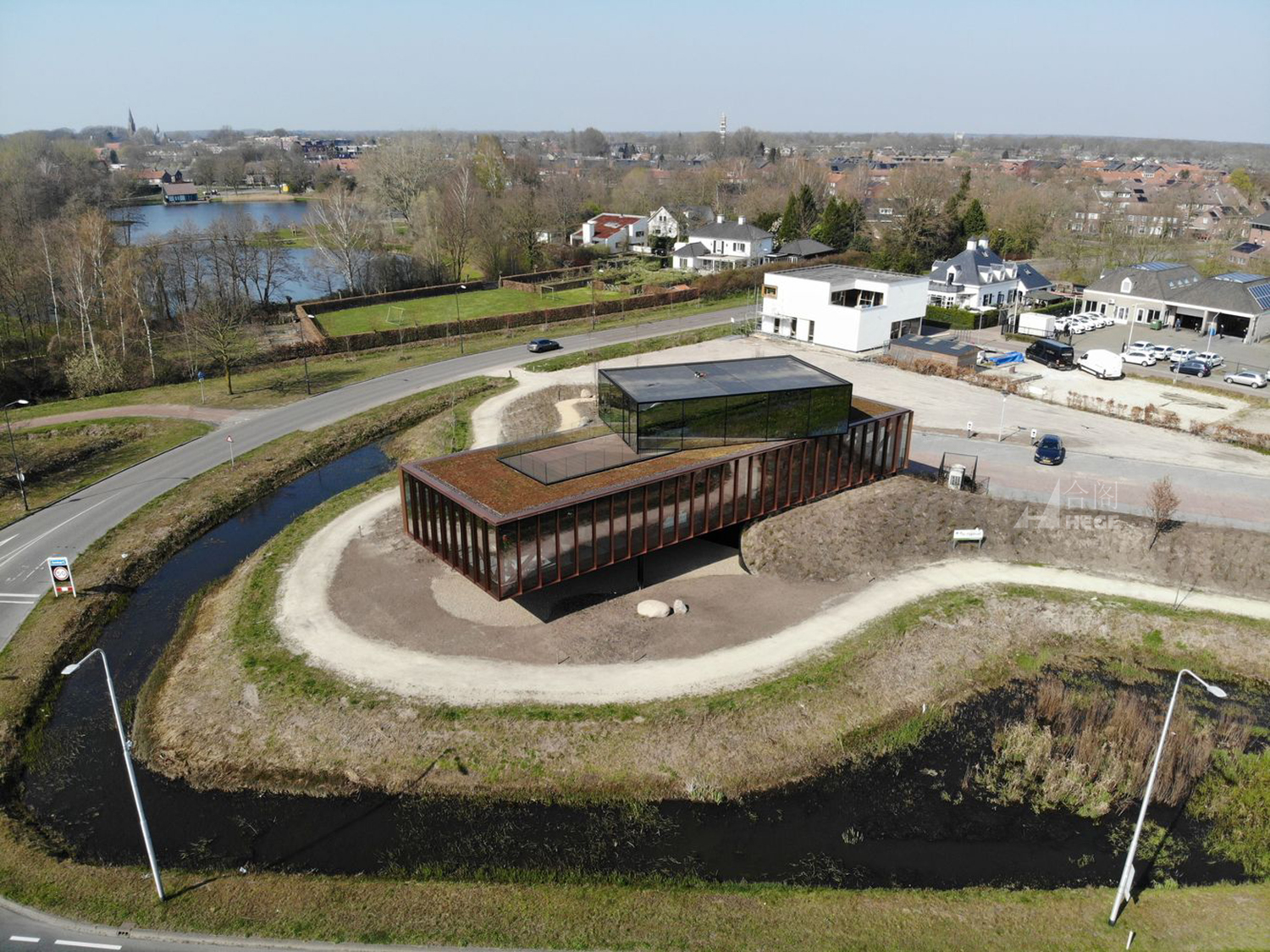 二樓,一個鏡面盒子容納了會議室和餐廳,相鄰的室外空間位于草屋頂之間。
