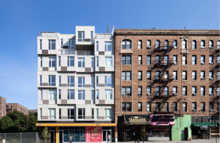 該項目有28個住宅單元(6個單間,6個一居室,14個兩居室,2個三居室)是用五十六個完整的工廠成品模塊在現(xiàn)場外預(yù)制建造的?;A(chǔ)設(shè)施和基礎(chǔ)建設(shè)在現(xiàn)場進行,在最初的三個月里,6層樓的建筑同時在工廠完成。在現(xiàn)澆混凝土基礎(chǔ)上建造了一個鋼柱網(wǎng)格結(jié)構(gòu),以承托堆疊的模塊。設(shè)計允許更寬的凈跨度,以便在第一層滿足商業(yè)租賃功能。安裝時間僅為四周。它的施工時間約10個月——比傳統(tǒng)施工方法短6個月。