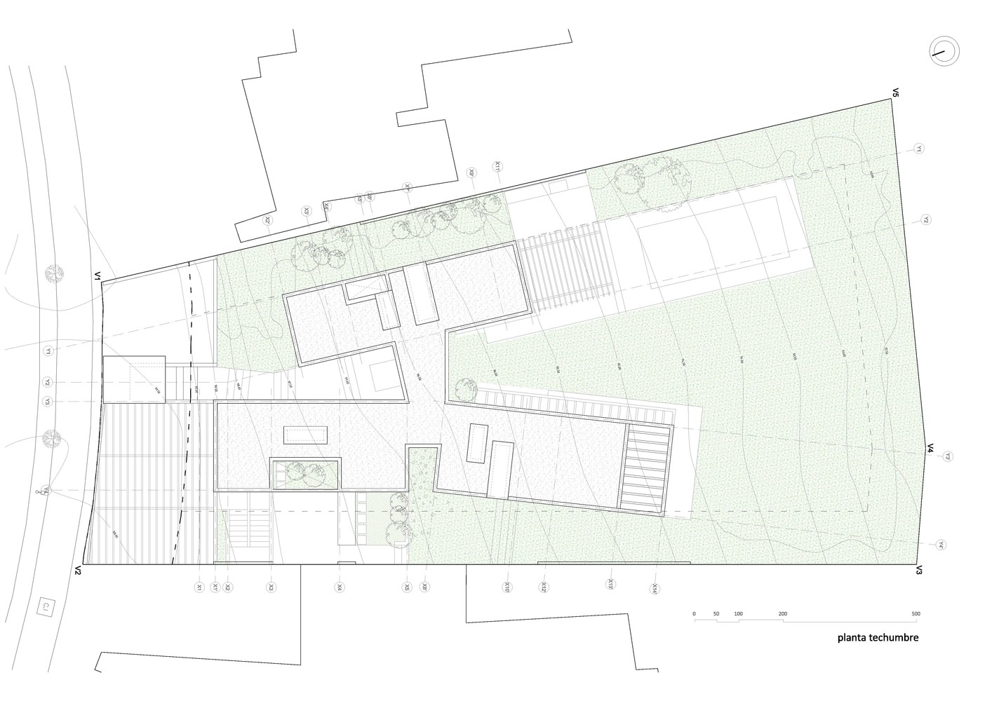 住宅位于一個(gè)形狀非常特殊、帶陡峭斜坡地盤,設(shè)計(jì)師設(shè)計(jì)了兩個(gè)長條形體量,使它們在街道上保持低調(diào)、但像開路一般擴(kuò)張進(jìn)入場地,延伸城市山谷的景觀(東南方向)。較低的高度使其直接與游泳池等室外元素互動,同時(shí)它包含沿著復(fù)雜地形的兩層通高空間與大玻璃窗。入口層由一個(gè)有著干凈白色外表面的配筋砌體下部塑造,所有空間均在同一標(biāo)高。雙層通高大廳連接兩個(gè)構(gòu)成住宅的體量。幾個(gè)庭院及露臺分布在整個(gè)住宅,給業(yè)主一個(gè)身處室外機(jī)會并創(chuàng)造了自然通風(fēng)采光。