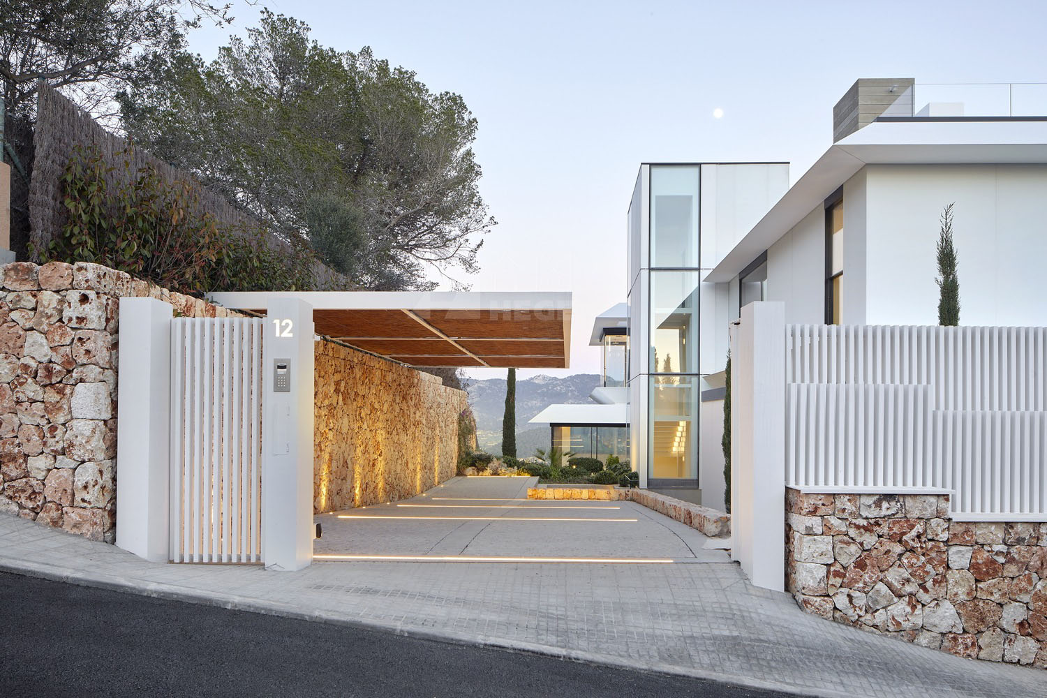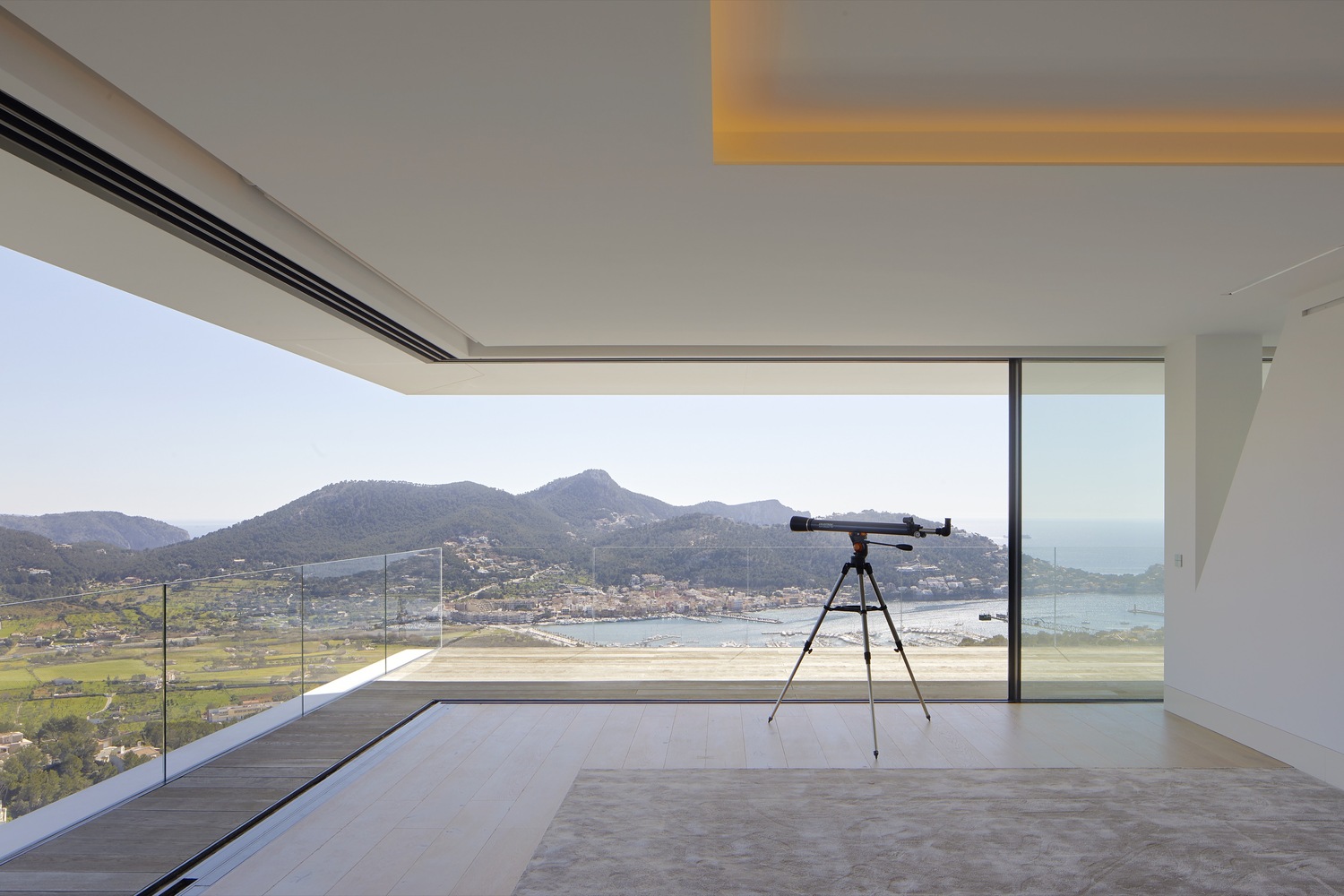 這是一座與天空有著密不可分聯(lián)系的住宅,它駐扎在山上;意圖飛躍遠(yuǎn)離山丘,逃離與地表的自然聯(lián)系。這個(gè)項(xiàng)目設(shè)計(jì)理念源于場(chǎng)地:一座山峰,一片空置的自然景觀場(chǎng)地,有著激動(dòng)人心的地形地勢(shì)與令人贊嘆的景致。一層盡可能抬高遠(yuǎn)離立面,這樣就為地面層提供了天然的遮蔭處。而地面層主要功能為起居空間、廚房和小電視房。因此,起居空間得以免受地中海海島毒辣的陽(yáng)光傷害。這樣一旦進(jìn)入室內(nèi),就會(huì)有令人驚喜的視覺(jué)效果。進(jìn)入室內(nèi),完整的山谷海洋全景一下子躍然眼前。室內(nèi)外之間沒(méi)有界限,有的只是一個(gè)大型的開(kāi)敞休息空間。由于無(wú)限效果的影響,游泳池一下將遠(yuǎn)方的海拉到住宅眼跟前。