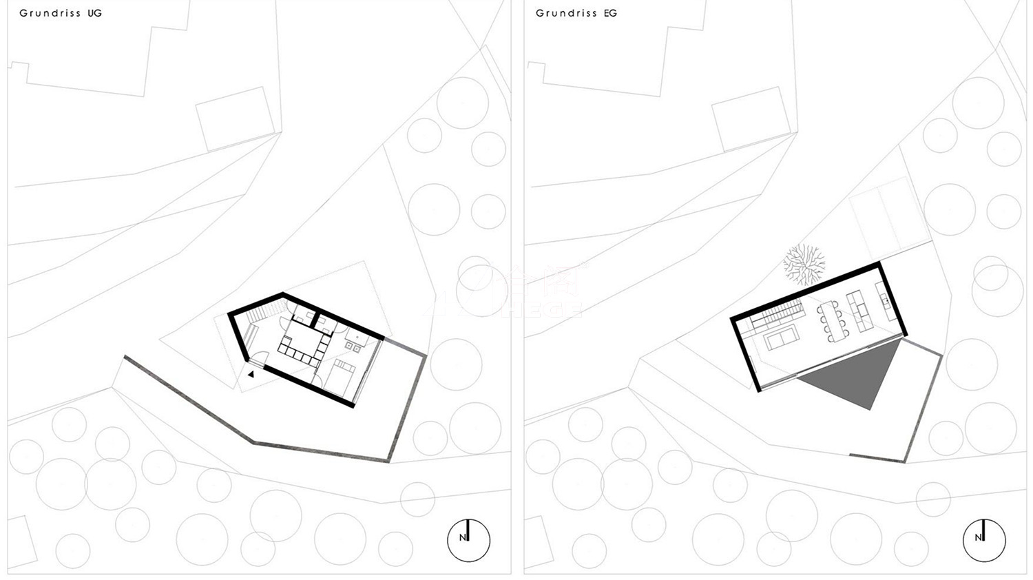 該住宅由兩個(gè)建筑體塊組成——一個(gè)均勻的黑色馬鞍狀屋頂建筑傾斜著,懸挑在一個(gè)白色的平屋頂盒子上。這些體量面向自然空間和森林,建筑與周圍的環(huán)境相比顯得安靜而簡潔。光線可以通過中間的樓梯照射到室內(nèi),自然帶來的溫暖給人一種與自然親密接觸而溫馨的感覺。房子內(nèi)部包括休息室,一個(gè)客廳,洗手間和臥室。房子運(yùn)用大片玻璃,早上可以享受到自然帶來的光線和溫度,而且?guī)Ыo人一種通透的感覺,但是只要拉上窗簾,房間仍然保持私密性。晚上房子內(nèi)部的燈光從從玻璃透出,就像一雙明亮而溫純的眼睛在夜間靜謐地綻放。