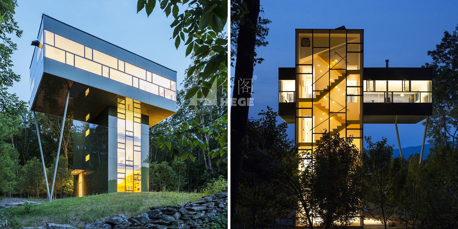 這個(gè)度假小別墅以用階梯通向樹冠屋頂?shù)姆绞竭M(jìn)行設(shè)計(jì),并在設(shè)計(jì)中把占地面積做到最小,以保護(hù)周圍的樹林植被免遭破壞,住宅前三層上面每一層都有一個(gè)包括了一間小臥室和浴室的迷你套房,頂層則是生活空間,就像森林中的樹冠一樣向四周散開,并在這里有著開闊的視野,可以看到遠(yuǎn)處的湖泊和山脈。屋頂戶外平臺(tái)上的生活空間一直擴(kuò)展到周圍的樹冠上,成為了一個(gè)角度極佳的觀景臺(tái)。同時(shí),用玻璃封閉起來的樓梯間也展現(xiàn)出了從底層到頂層的空間形態(tài),背面涂有深綠色的玻璃表面不僅能夠反射出周圍的樹林,同時(shí)也掩飾住了建筑的形態(tài),到了黃昏時(shí)分,樓梯間內(nèi)點(diǎn)綴著的迷你燈光就好像是森林里的螢火蟲在夜幕中閃閃發(fā)光。
