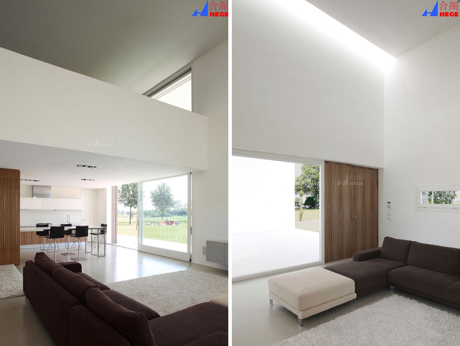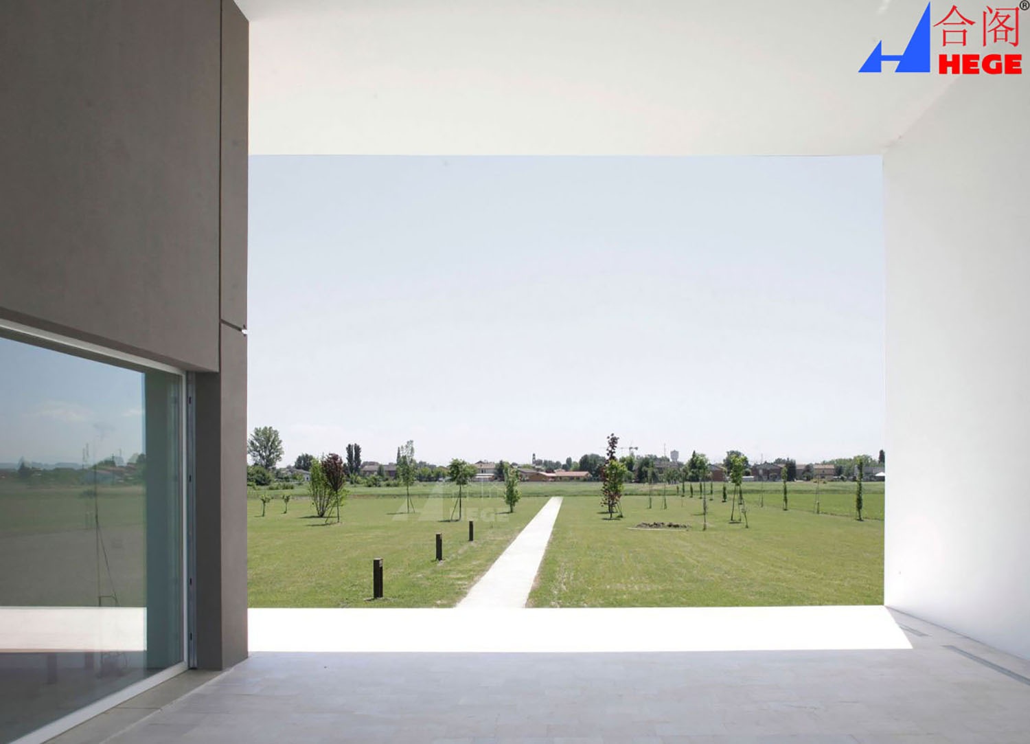 巨大的門廊也明晰了房子和鄉(xiāng)村之間的界限。“獨(dú)立的物件",如樓梯和有著同樣的形式和具象性的斜坡,代表了公路和小道的自然延伸。
