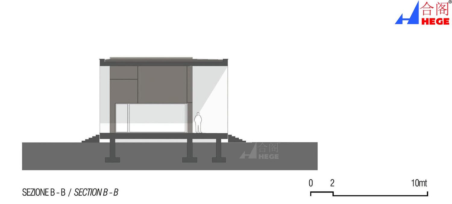 建筑模塊與道路的關(guān)系以及它作為景觀的完整的一部分;這由加強(qiáng)內(nèi)外的視點(diǎn)和通過虛實(shí)(門廊和窗戶)間的互動(dòng)來實(shí)現(xiàn)的。建筑與景觀、遠(yuǎn)與近、公共與私密、觀察者與瞭望臺(tái)的關(guān)系也被納入考慮。