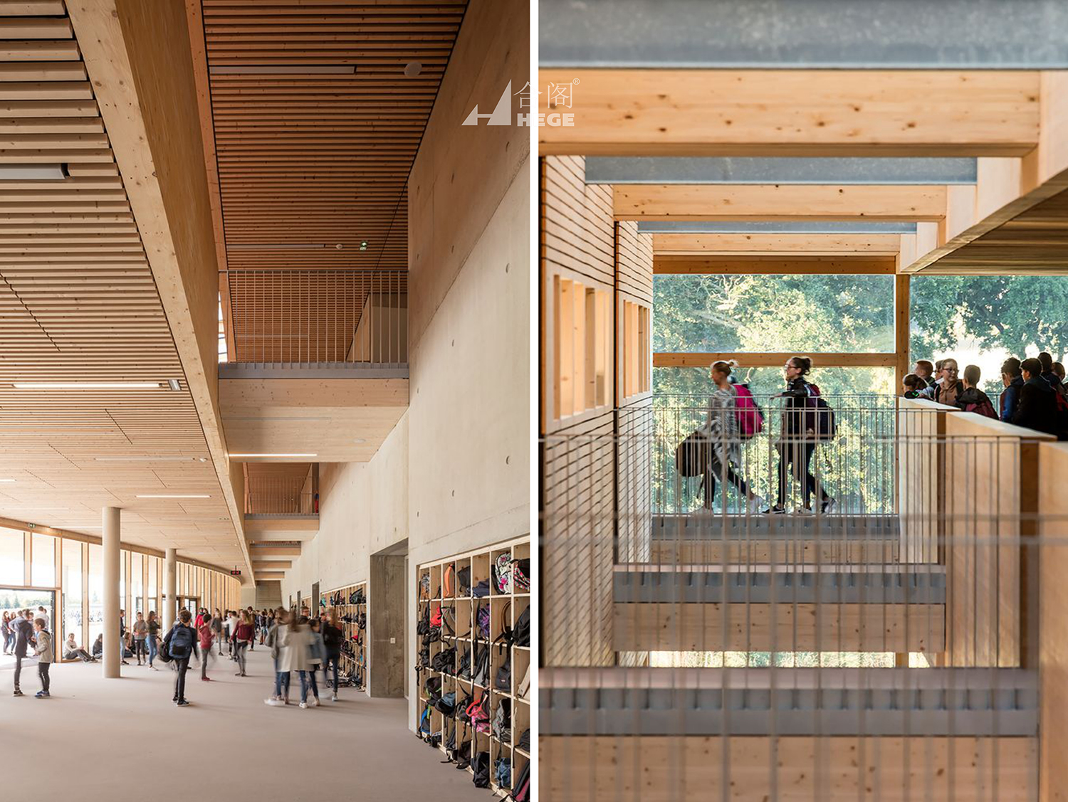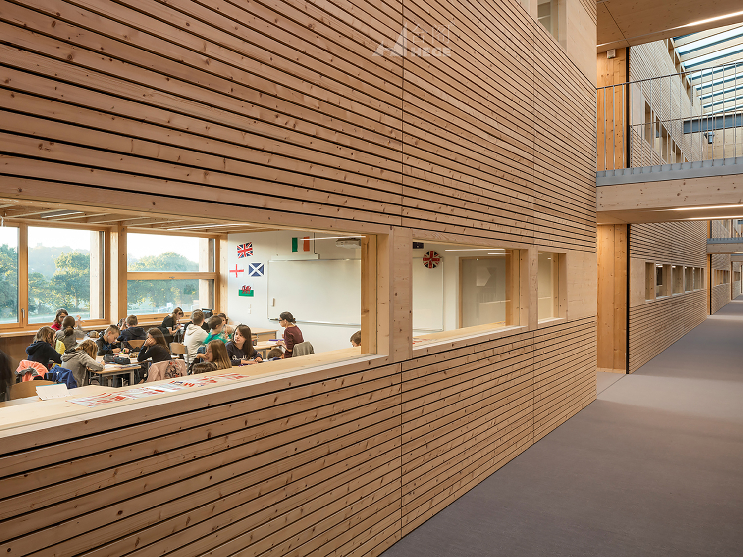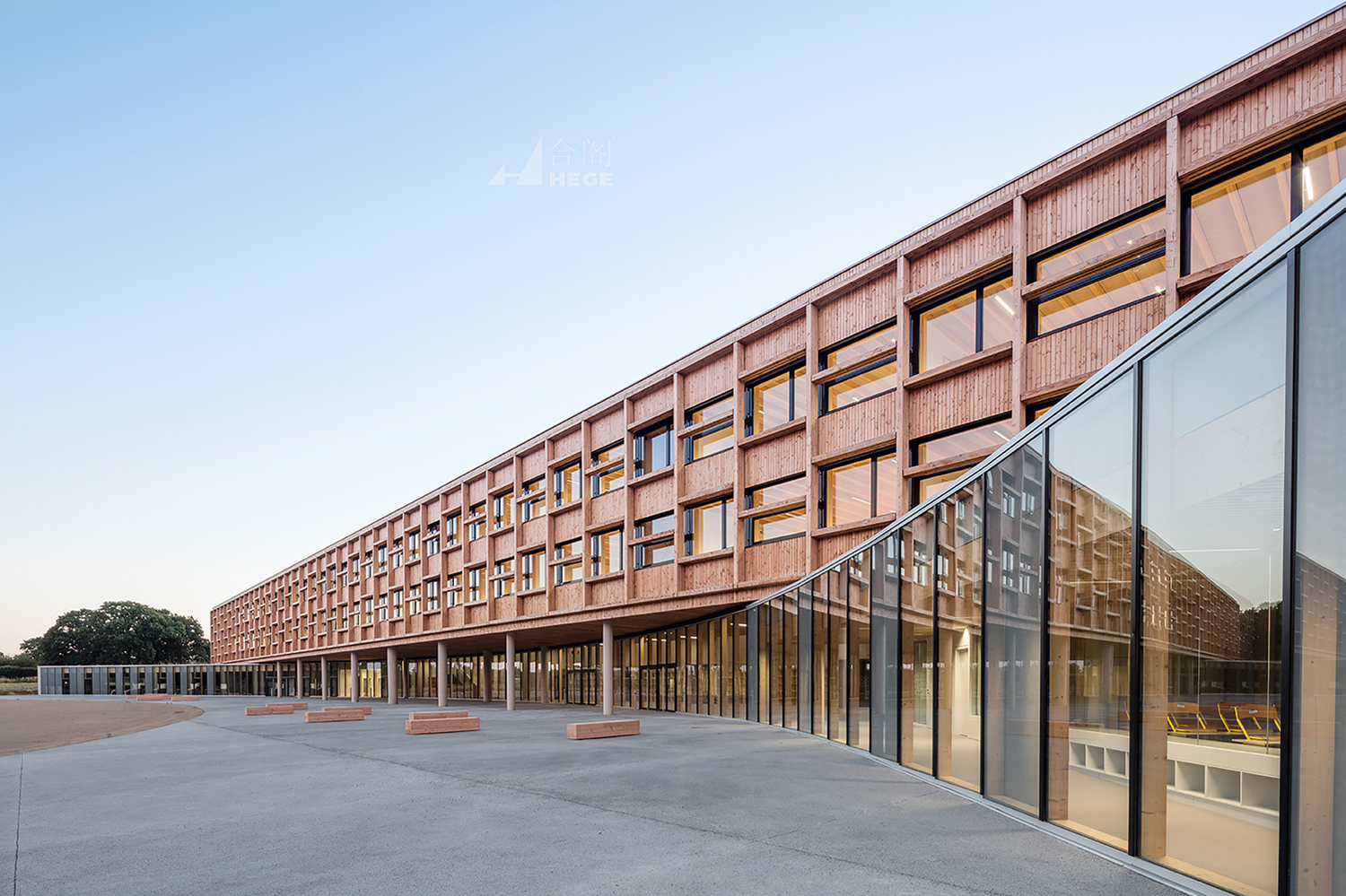 建筑底層的玻璃幕墻給建筑帶來輕盈感。一層容納了入口大廳、風(fēng)雨操場、教育空間、多功能室和食堂。在面向東南和西北的立面上,垂直和水平的木制遮陽板控制著兩層教室的采光量。遮陽板的使用增加了立面的厚度,它們的形狀也豐富線性建筑的形式。