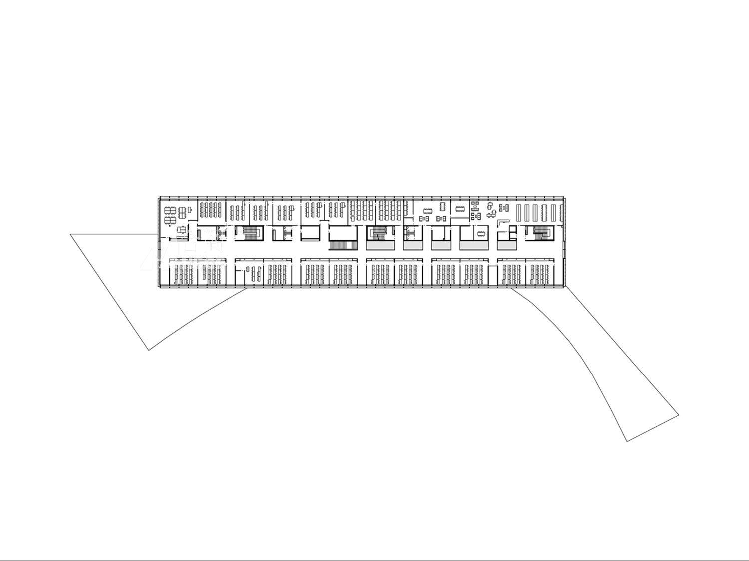 - 它由兩個獨(dú)立的建筑組成:一個長長的直線平行六面體位于輕微彎曲的基座上,以呼應(yīng)場地的地形并與景觀融為一體。
