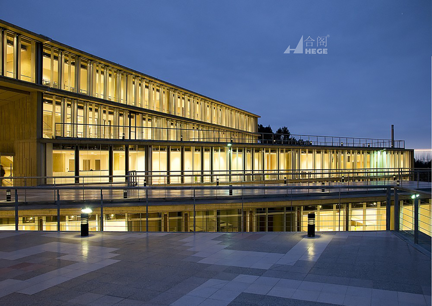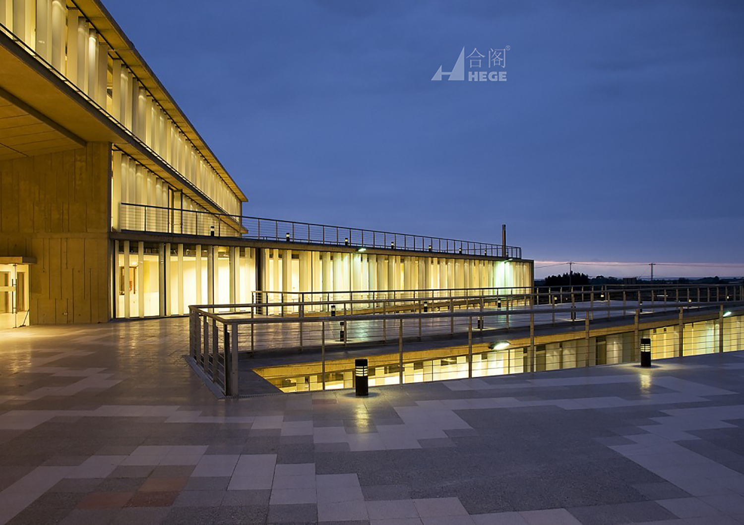 建筑面向在城市與河流間的落客區(qū)分成了幾個體塊,并在其間形成了開放的露臺。這些露臺將河濱景觀引入建筑,恢復(fù)了老城的視廊。兩棟核心建筑被與街道平面連接的部分拱衛(wèi)著。東部的體塊包含大禮堂、多功能廳及在二層的餐廳。餐廳與一個開放的觀景平臺相連。大禮堂占用兩層,因而可以從外部通過上層進入,也可以從內(nèi)部的下層進入。