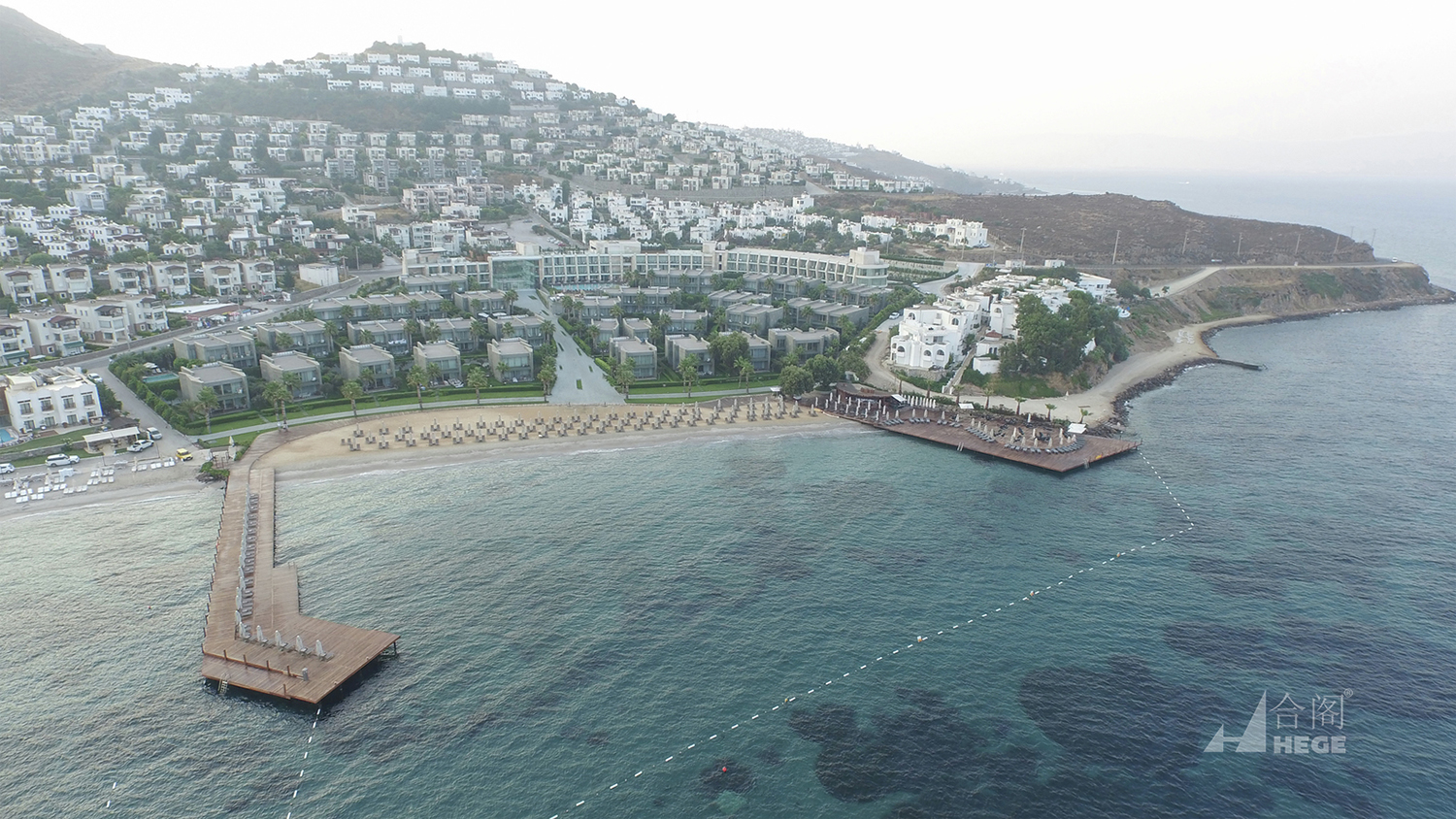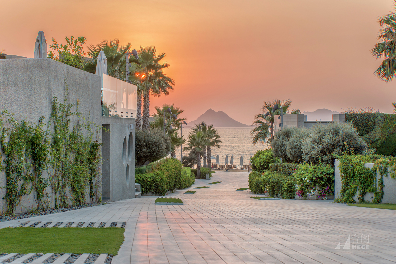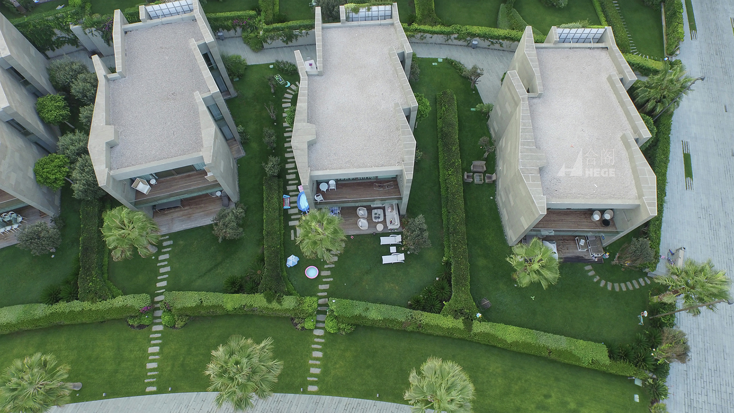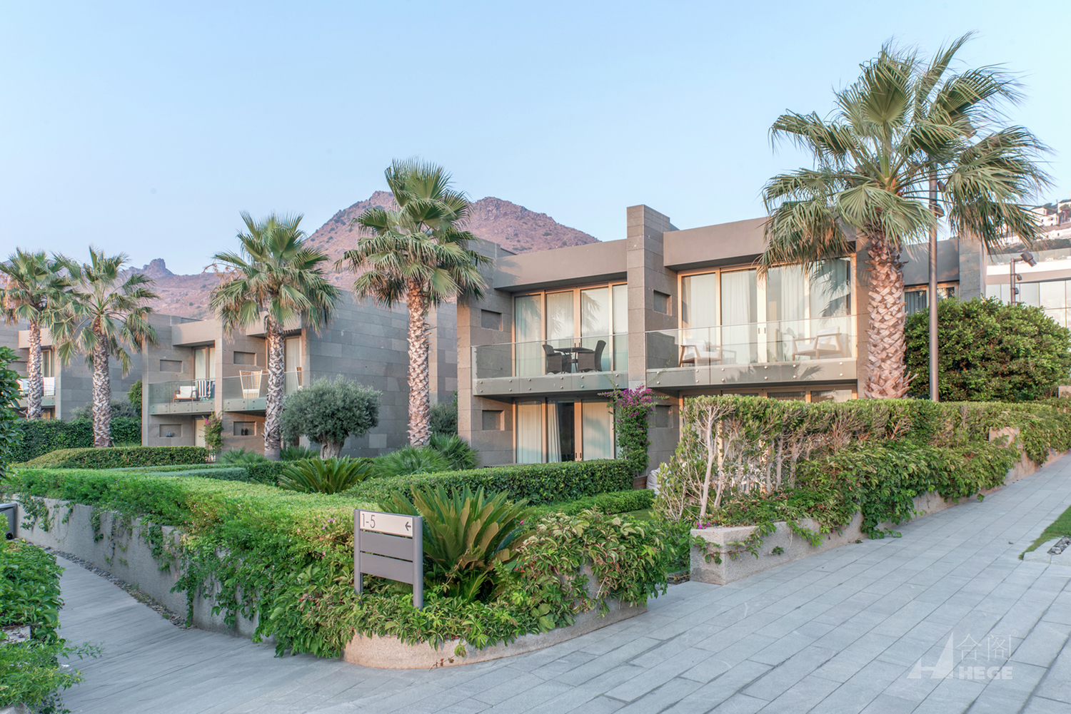 酒店是一個(gè)海灘開發(fā)項(xiàng)目。該項(xiàng)目作為酒店可以容納60個(gè)房間、46個(gè)公寓以及27個(gè)居住別墅,并且包含了spa、健身房和泳池等設(shè)施。酒店具有扭轉(zhuǎn)的結(jié)構(gòu),位于場(chǎng)地的最高點(diǎn),作為了開發(fā)的門面。一條人行道從酒店的大堂直達(dá)海邊,橋狀的懸浮空間末端具有海景餐廳和酒吧,可以直面大海。這一主軸線成為了場(chǎng)地交通的脊椎。公寓和別墅被設(shè)計(jì)在一系列平臺(tái)上,沿海瀑布般展開,提供了最大的可能視野。每一個(gè)別墅在上層是私密的臥室,下層是巨大的起居室以及花園,圍墻退到建筑的一邊,為每一座別墅提供了海景。幕墻為建筑增添了另一層的細(xì)節(jié),并且可以遮擋夏日的陽(yáng)光。