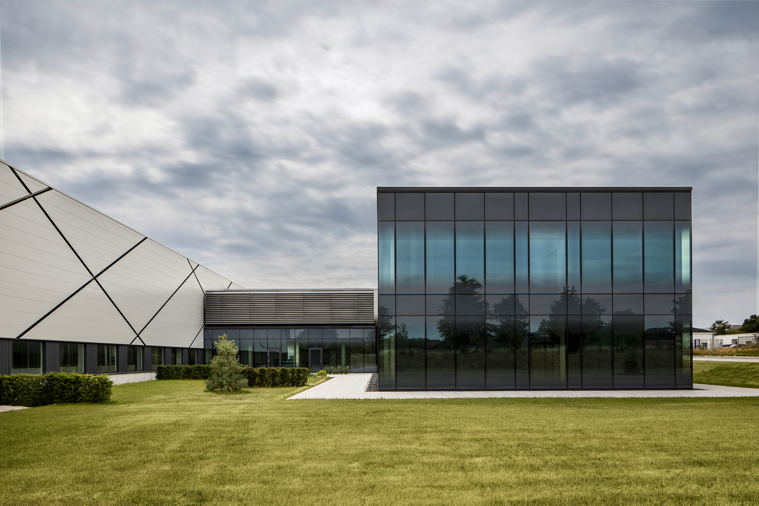 頂篷的棱角和多面形狀,包裹著半透明的三層玻璃幕墻,,同時借鑒了其調(diào)色板,以其標(biāo)志性的質(zhì)量補充和提升了公司的形象。它俯沖的棱角線呼應(yīng)了工廠建筑的切割線,將兩座建筑統(tǒng)一起來。