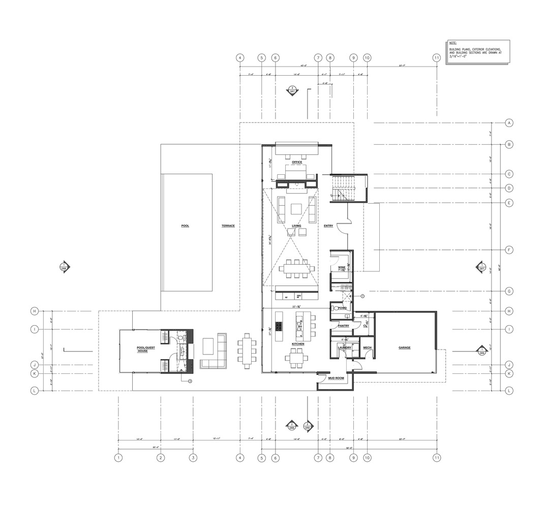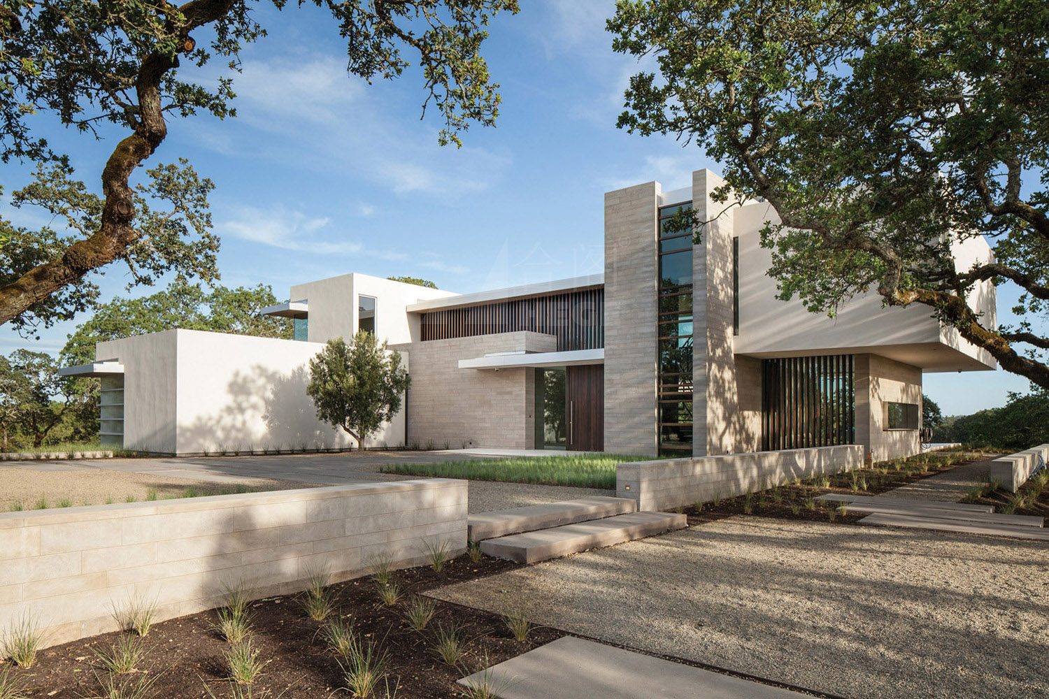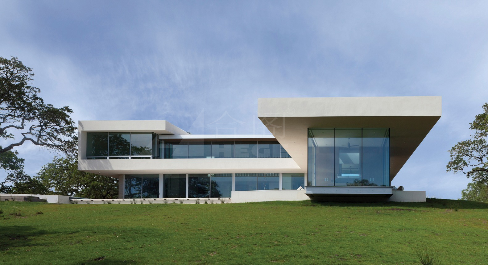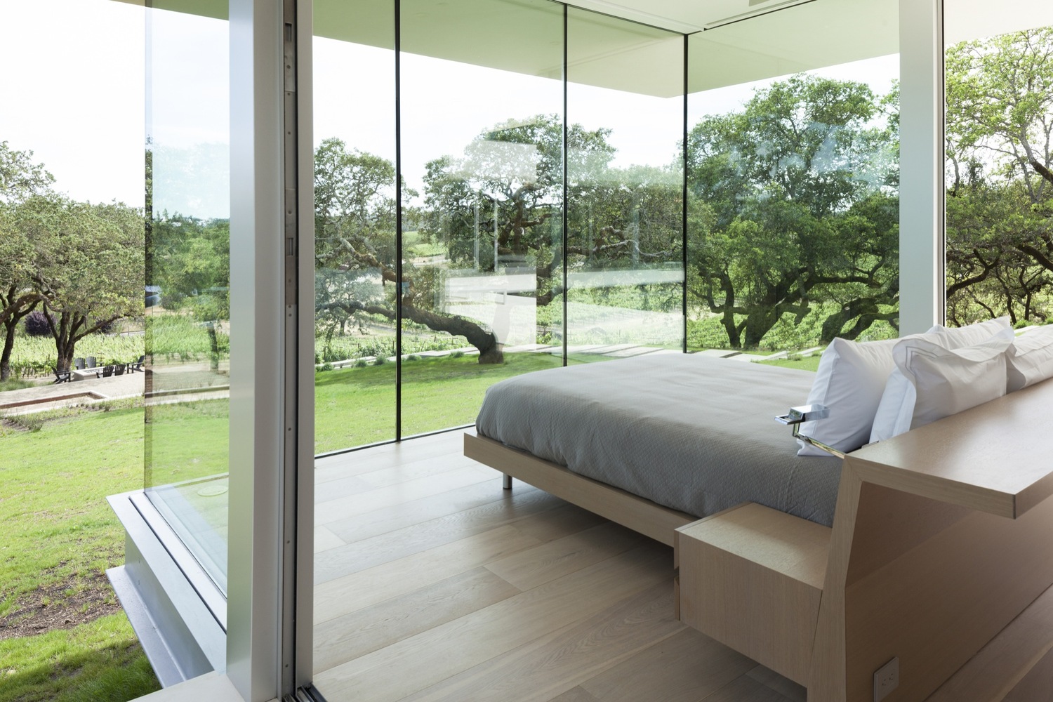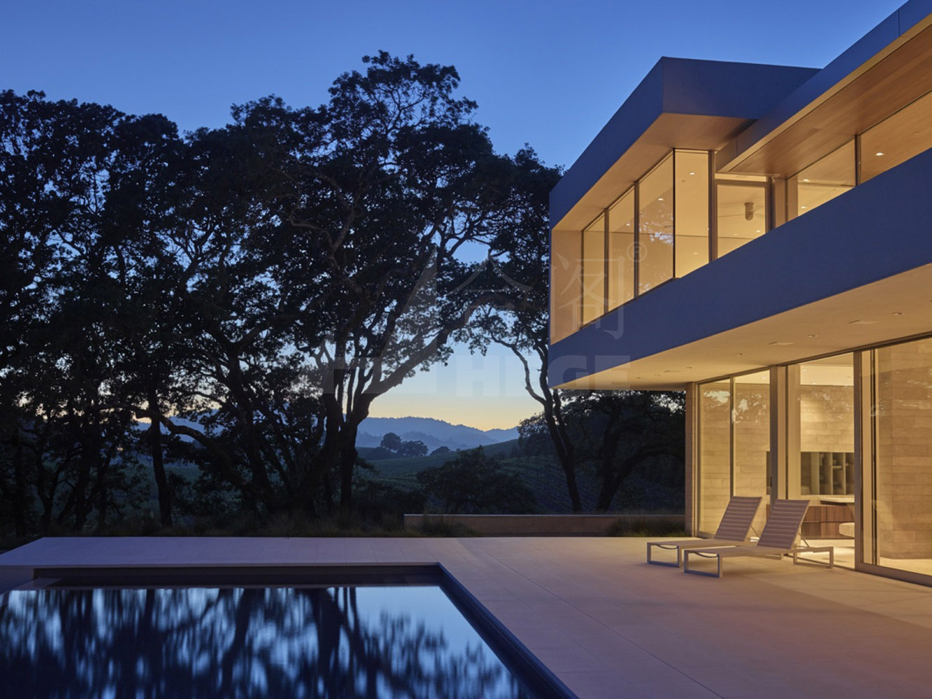房子主要設(shè)計(jì)的是公共區(qū)域和臥室。主臥室是從孩子們的房間連接一座小橋通往的一個(gè)大房間,占用了許多空間。在樓下,有廚房,辦公室以及兩個(gè)開(kāi)放的泳池,并在大房間裝了滑動(dòng)玻璃門(mén)。建筑中的套房,被設(shè)想是作為一個(gè)玻璃盒子伸出陽(yáng)臺(tái)的邊緣,同時(shí)作為主建筑的屋頂?shù)降孛嬷g的一個(gè)獨(dú)立的建筑。該房間在主樓邊,同時(shí)能夠享受270度的全景景觀,并且將間隙空間利用起來(lái)建成了戶外廚房和休息室,能在露臺(tái)看到葡萄園的景色。