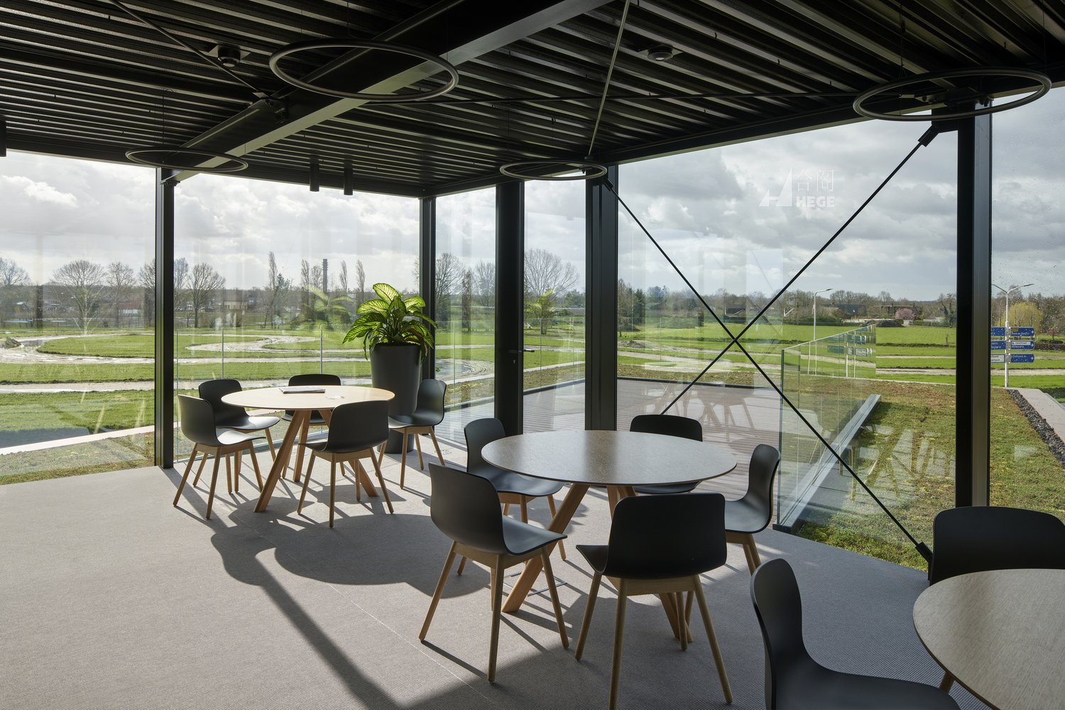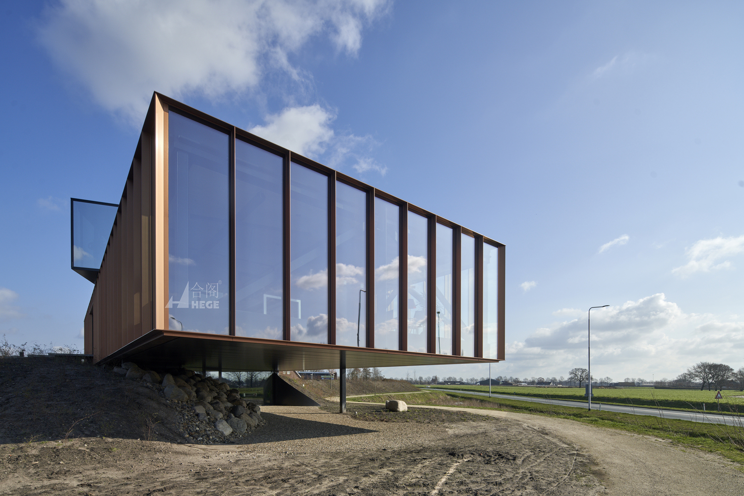 二樓,一個鏡面盒子容納了會議室和餐廳,相鄰的室外空間位于草屋頂之間。