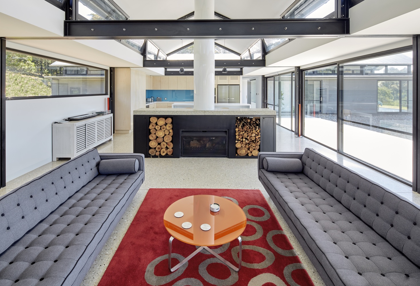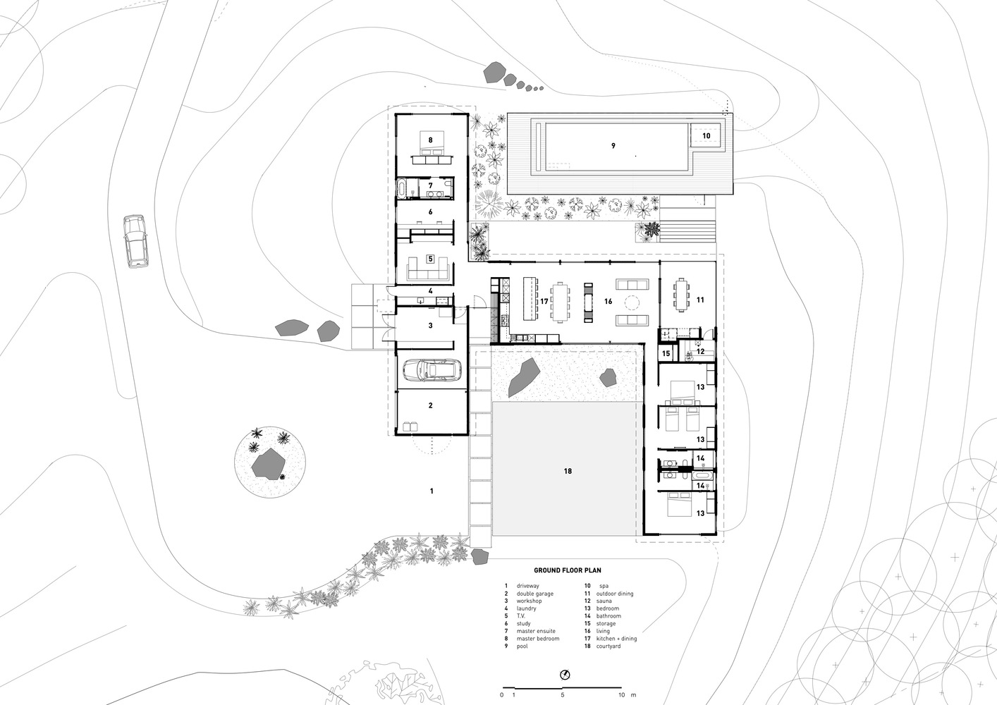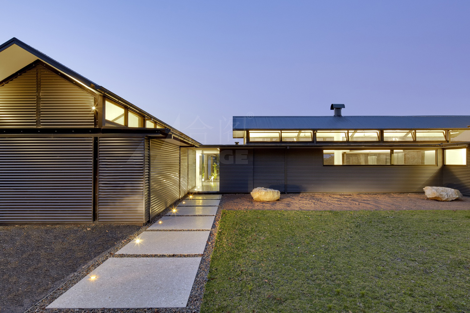 這座度假村別墅坐落在山頂上,俯瞰著袋鼠河對岸的山谷,四周被國家森林所環(huán)繞。住宅被設計成一系列相互連接的亭子,在南側(cè)形成一個受保護的入口庭院,并向北側(cè)的周圍景觀開放。該住宅的設計是低維護和堅固的,并使用被動式環(huán)境控制,如太陽能在地板上促進循環(huán)加熱,天花板風扇輔助的交叉通風,豐富的自然光線,LED照明,以及15萬升水儲存和可發(fā)電5千瓦時的光電板和現(xiàn)場廢物處理。房子的位置允許每個房間都能看到景色和側(cè)面,并圍繞著中央位置的開放式客廳連接,開放式的壁爐、高高的天花板和從泳池到遠處的山谷的視野。