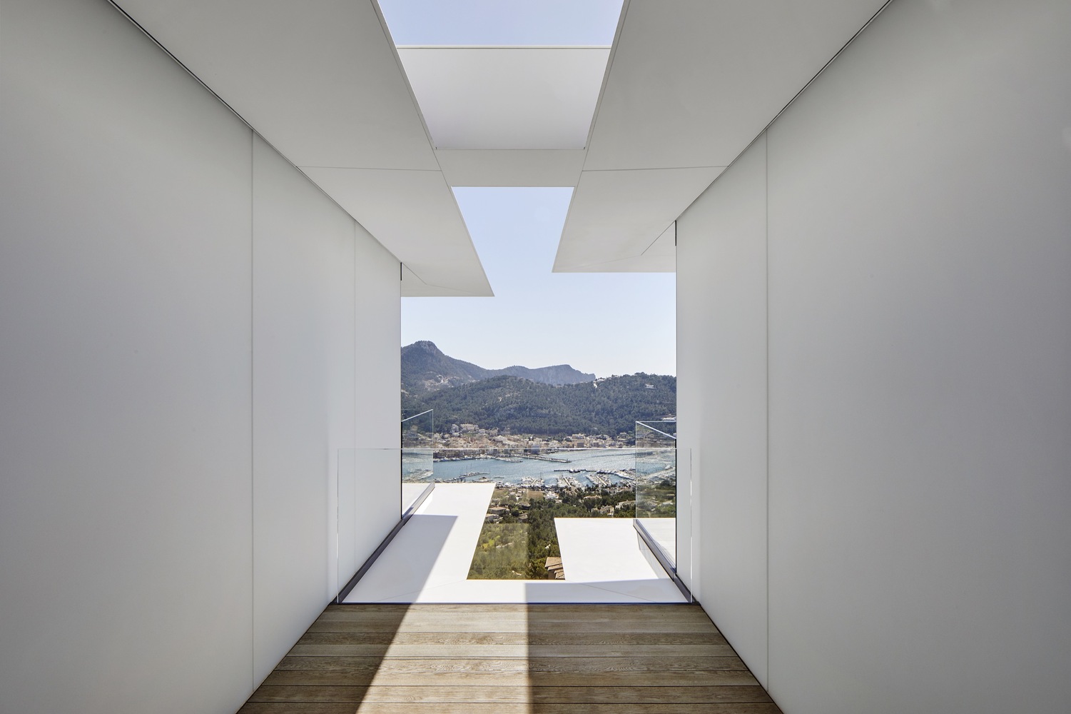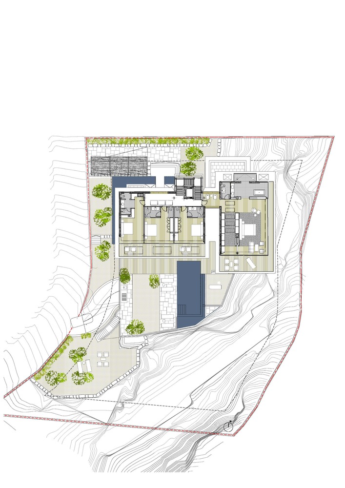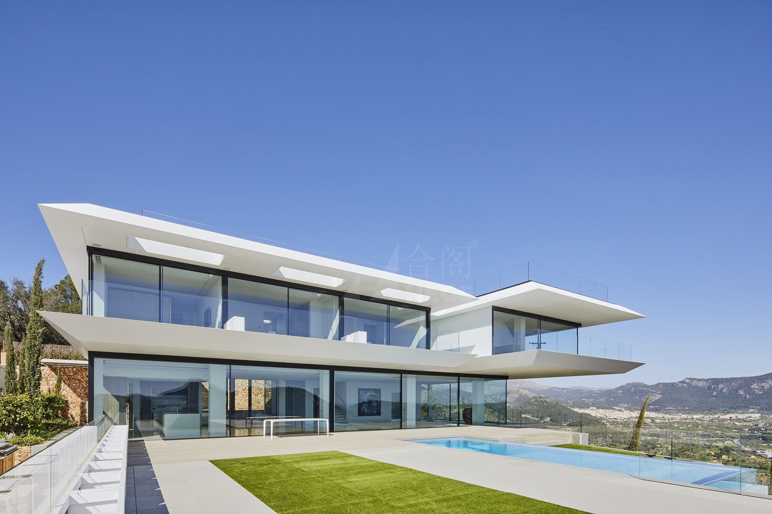 這是一座與天空有著密不可分聯(lián)系的住宅,它駐扎在山上;意圖飛躍遠(yuǎn)離山丘,逃離與地表的自然聯(lián)系。這個(gè)項(xiàng)目設(shè)計(jì)理念源于場(chǎng)地:一座山峰,一片空置的自然景觀場(chǎng)地,有著激動(dòng)人心的地形地勢(shì)與令人贊嘆的景致。一層盡可能抬高遠(yuǎn)離立面,這樣就為地面層提供了天然的遮蔭處。而地面層主要功能為起居空間、廚房和小電視房。因此,起居空間得以免受地中海海島毒辣的陽(yáng)光傷害。這樣一旦進(jìn)入室內(nèi),就會(huì)有令人驚喜的視覺(jué)效果。進(jìn)入室內(nèi),完整的山谷海洋全景一下子躍然眼前。室內(nèi)外之間沒(méi)有界限,有的只是一個(gè)大型的開(kāi)敞休息空間。由于無(wú)限效果的影響,游泳池一下將遠(yuǎn)方的海拉到住宅眼跟前。