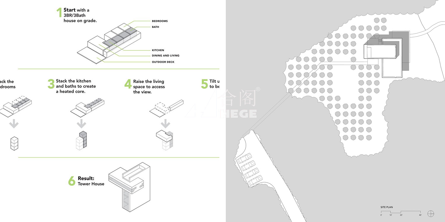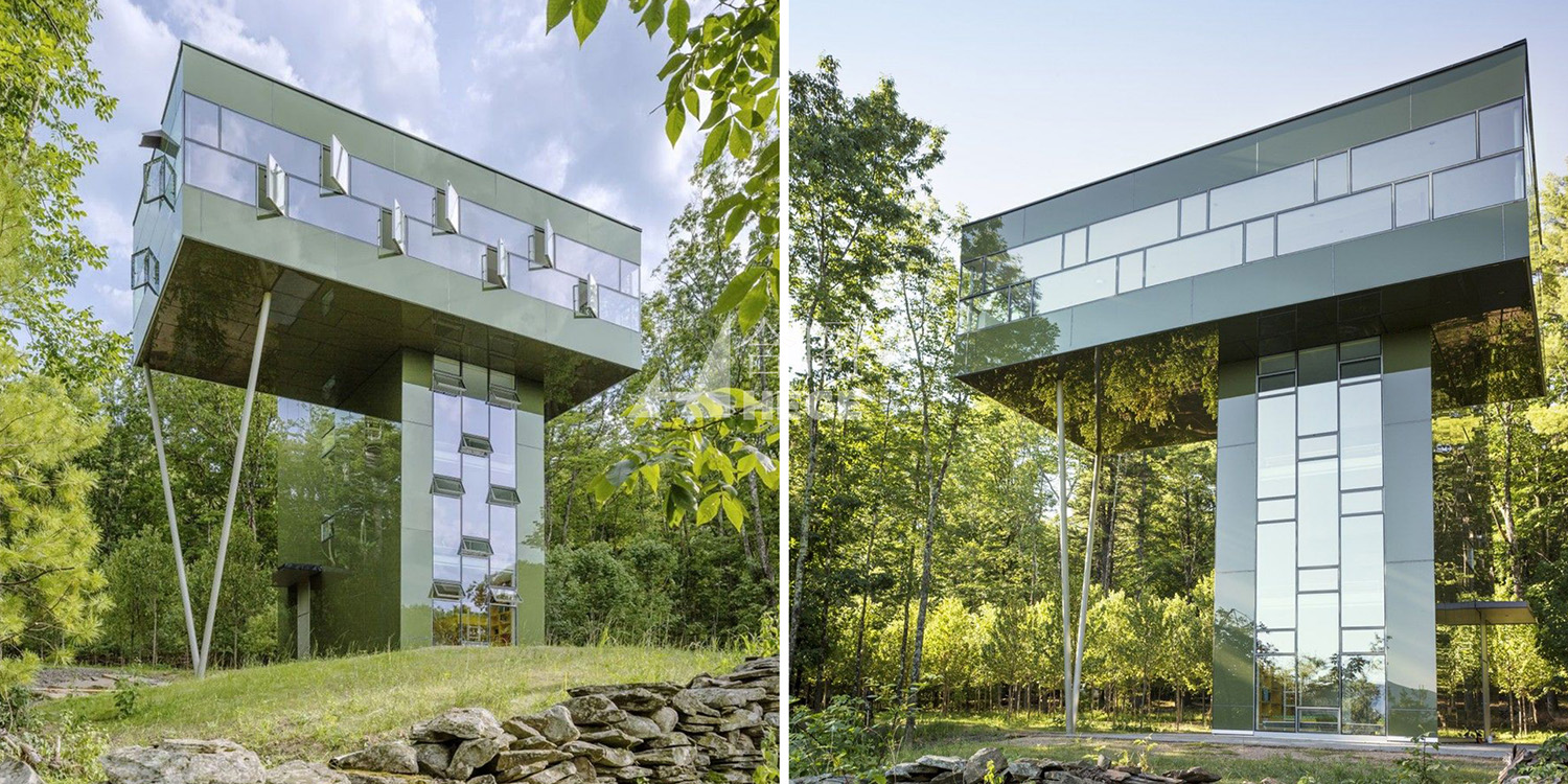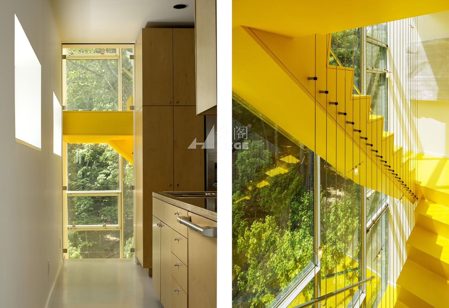 這個(gè)度假小別墅以用階梯通向樹冠屋頂?shù)姆绞竭M(jìn)行設(shè)計(jì),并在設(shè)計(jì)中把占地面積做到最小,以保護(hù)周圍的樹林植被免遭破壞,住宅前三層上面每一層都有一個(gè)包括了一間小臥室和浴室的迷你套房,頂層則是生活空間,就像森林中的樹冠一樣向四周散開,并在這里有著開闊的視野,可以看到遠(yuǎn)處的湖泊和山脈。屋頂戶外平臺(tái)上的生活空間一直擴(kuò)展到周圍的樹冠上,成為了一個(gè)角度極佳的觀景臺(tái)。同時(shí),用玻璃封閉起來的樓梯間也展現(xiàn)出了從底層到頂層的空間形態(tài),背面涂有深綠色的玻璃表面不僅能夠反射出周圍的樹林,同時(shí)也掩飾住了建筑的形態(tài),到了黃昏時(shí)分,樓梯間內(nèi)點(diǎn)綴著的迷你燈光就好像是森林里的螢火蟲在夜幕中閃閃發(fā)光。