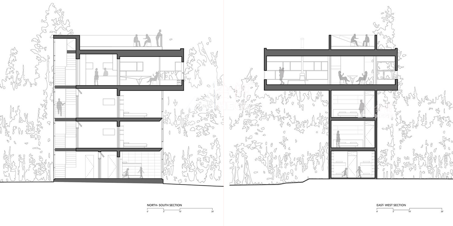 作為度假別墅,在冬季只有幾個(gè)周末會(huì)被使用,而在夏季則幾乎每個(gè)周末都會(huì)被使用??蛻粢髮⒃搫e墅設(shè)計(jì)成一個(gè)可持續(xù)發(fā)展,高效節(jié)能的建筑,并且將使用成本和維護(hù)成本降到最低。朝北面的疊放的臥室充分的利用了落地玻璃窗帶來的充足的光線和視野范圍。為了優(yōu)化節(jié)能,設(shè)計(jì)師將供熱和制冷分成了兩部分來設(shè)計(jì),為保持可持續(xù)性發(fā)展的策略,盡可能的在冬天減少加熱方式,在夏天則避免使用空調(diào)。